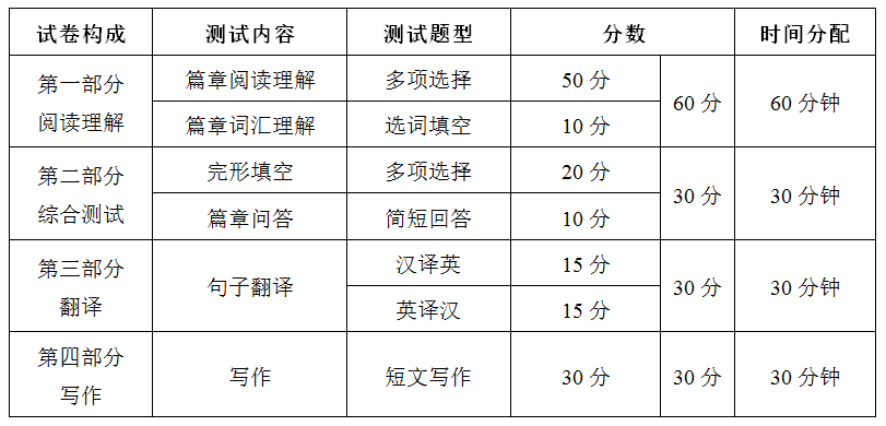 专升本英语考试由四个部分组成:1)阅读理解;2)综合测试;3)翻译;4)写作。满分为150分,考试时间为150分钟。各部分测试内容、题型、分数和时间分配如下: