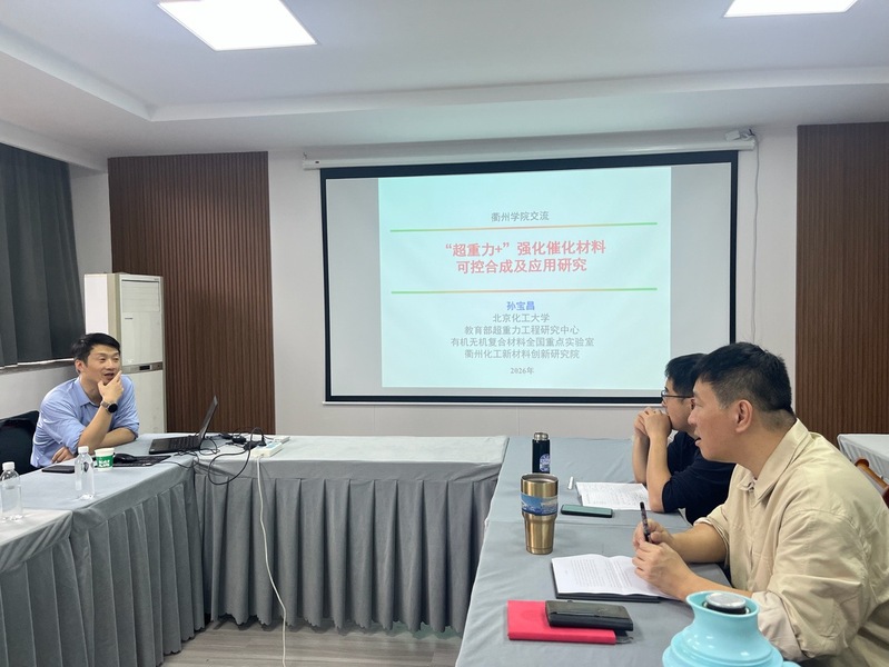 2026年4月17日,北京化工大学孙宝昌教授应邀来化学与材料工程学院参观交流,并为化材师生作了一场题为《“超重力+”强化催化材料可控合成及应用研究》的学术报告。报告会由化材学院院长戴宏主持,学院副院长余建刚、相关师生参加。